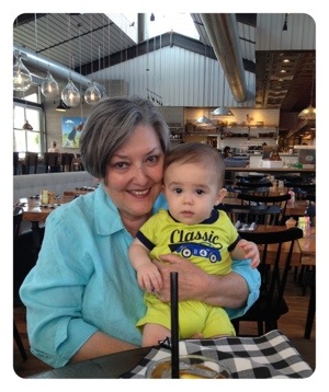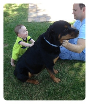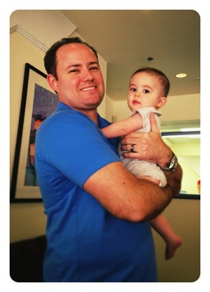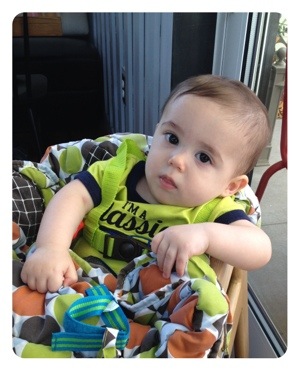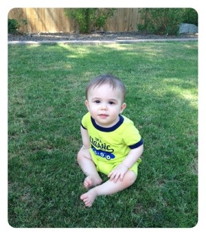 Lil B has been developing like a little champ. He now can sit on his own, he is crawling and standing everywhere, he took his first trip in a shopping cart with mommy and daddy, he sat in a high chair for the first time at restaurant, he crawled on the grass for the first time, Buddy let him climb up his back and he got his first TOOTH! What a great big month. It is so exciting and everyday is more fun. Tomorrow, Mommy and Lil B start music classes together – a great way to kick off the next month. This month also brings our first vacation and Lil B will get to play in the sand and ocean for the first time. Yay!
