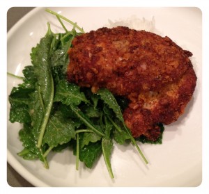 4. Dip chicken breasts in egg to coat and let excess drip away then put in crust mixture and coat. Repeat with remaining chickent breasts.